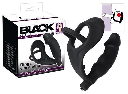 Czarny pierścień na penisa z korkiem analnym z wibracjami sterowanymi za pomocą jednego przycisku.