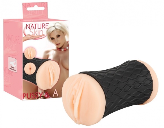 Masturbator w kolorze cielistym wykonany z materiału podobnego do naturalnej skóry. Z dwoma otworami (wagina i anus) w czarnej obudowie. Wnętrze tunelu przyjemności od strony pochwy posiada wypustki, a od strony anusa rowki
