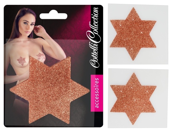 Mieniące się gwiazdki w kolorze miedzianym z powłoką klejącą do przyklejenia na sutkach. Zakrywają również obwódkę sutków i są idealne do dużych piersi.